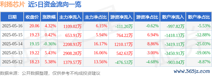 5月16日的资金流向数据方面,主力资金净流入1109.02万元,占总成交额6.15%,游资资金净流出111.2万元,占总成交额0.62%,散户资金净流出997.82万元,占总成交额5.53%。